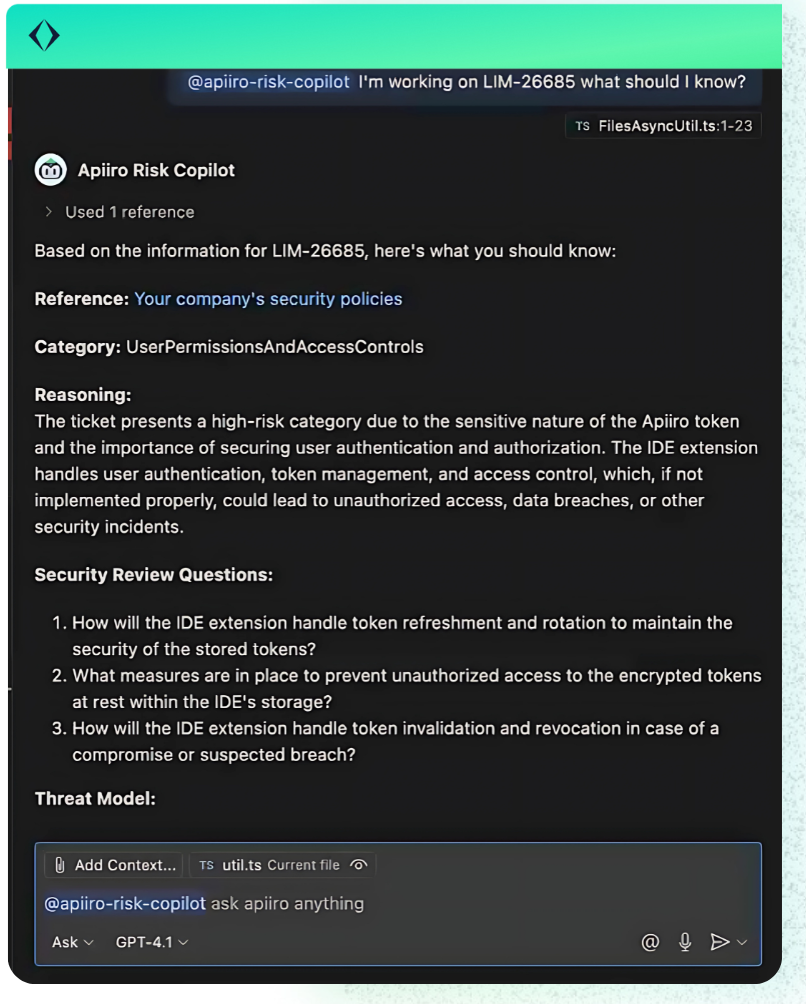 Behind the scenes, every interaction taps into Apiiro’s unique and critical data on your software architecture, ensuring that whether triggered from your IDE or Apiiro’s platform, you get the same context-aware guidance designed to accelerate secure development at scale. Every response contributes to real-time risk posture tracking, SLA reporting, and evidence collection without requiring developers or AppSec teams to manually log actions or updates.
