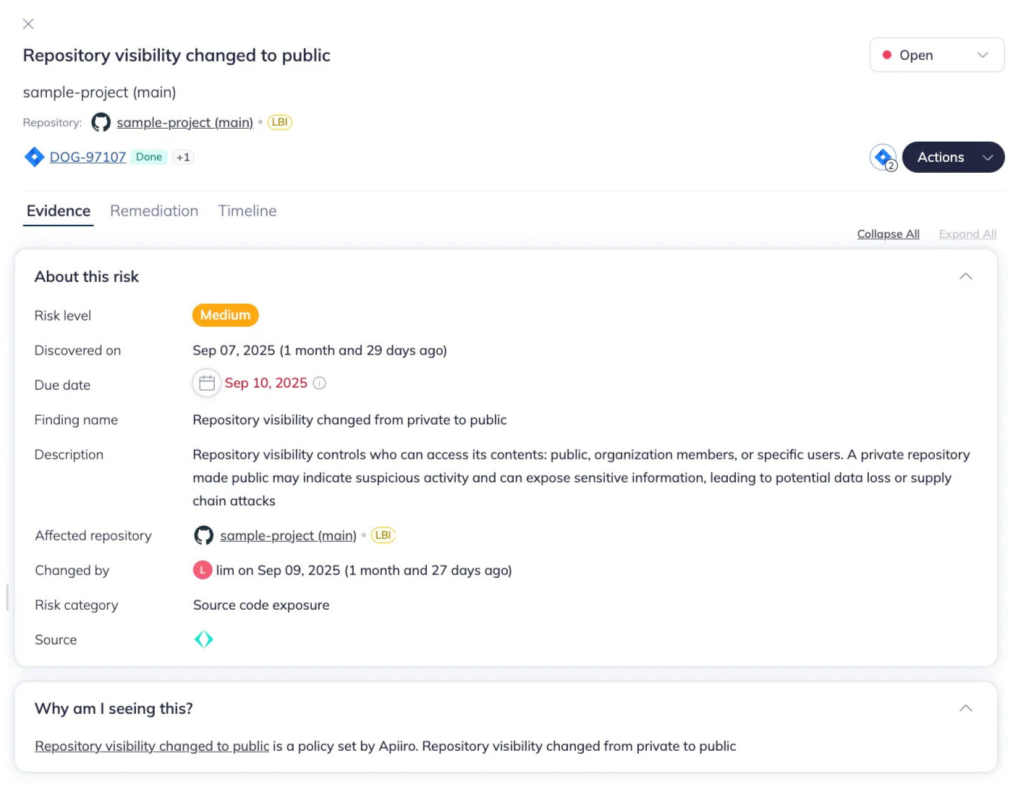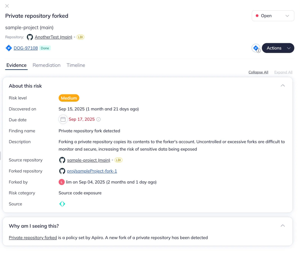 Apiiro monitors repository-level activity to detect abnormal or suspicious behaviors that may indicate potential leaks, or exposure of the organization’s source code.